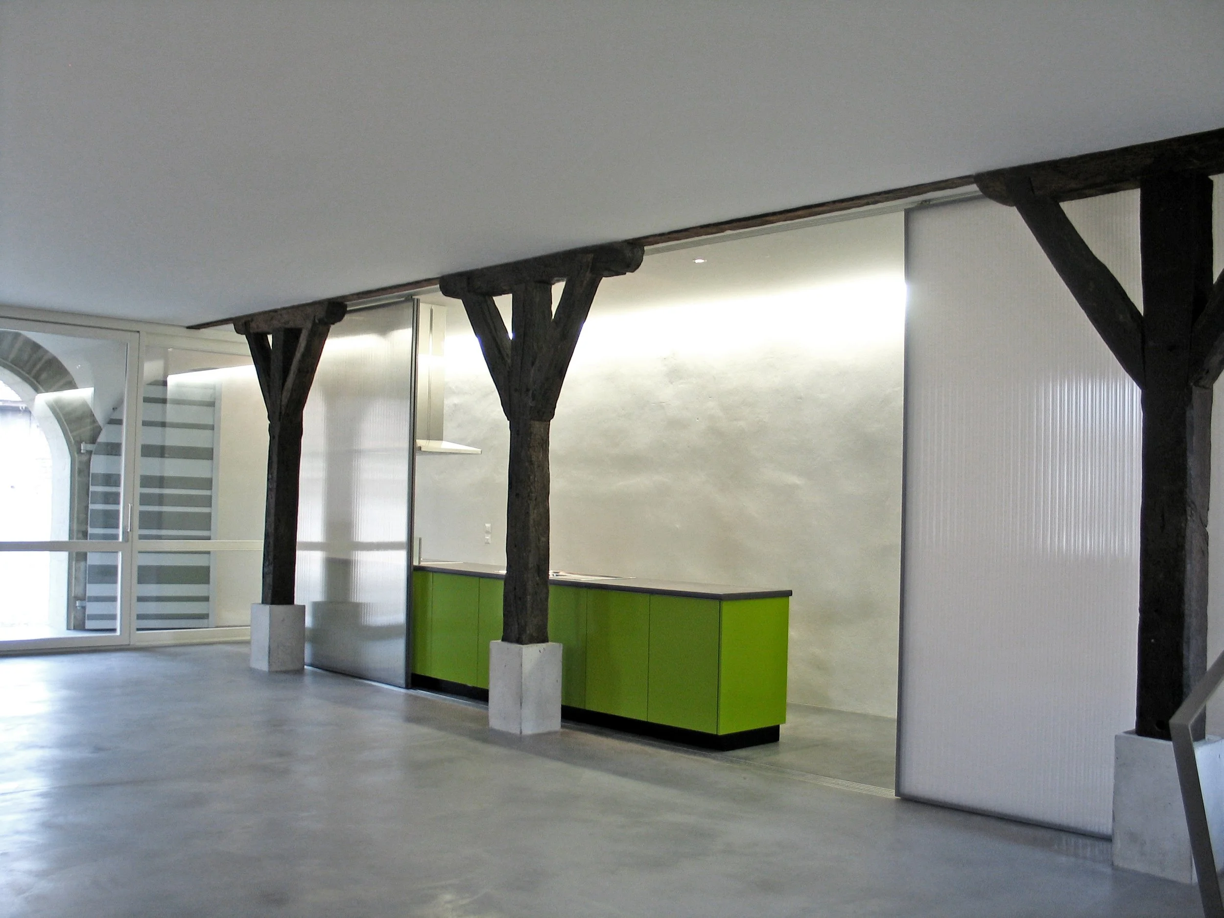 La ferme proprement dite, qui abritait déjà des logements, a fait l’objet d’une profonde transformation et d’importants renforcements structurels. Cinq appartements s’organisent autour d’une cage d’escalier commune et les combles sont rendues habitables, éclairées par de nouvelles lucarnes et deux grandes verrières.